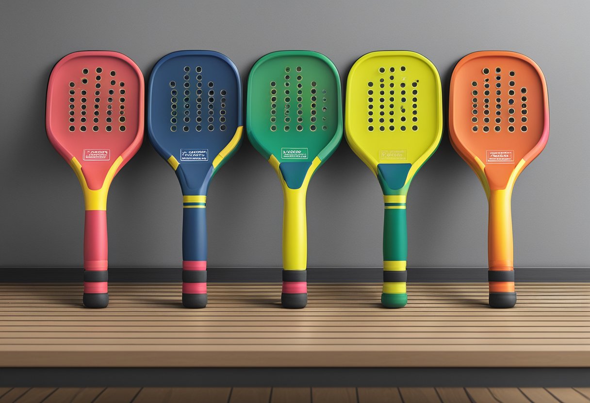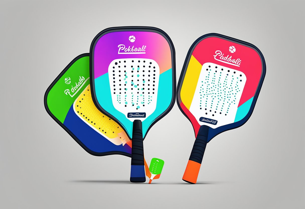 Three pickleball paddles displayed on a colorful background with labels indicating different play styles